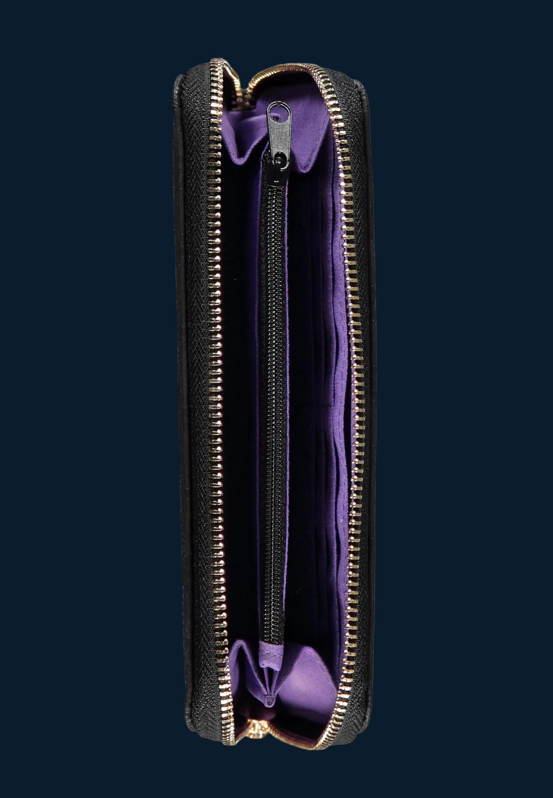 - Voorzien van diverse vakken voor creditcards, bankbiljetten en bonnetjes, met een paarse voering.